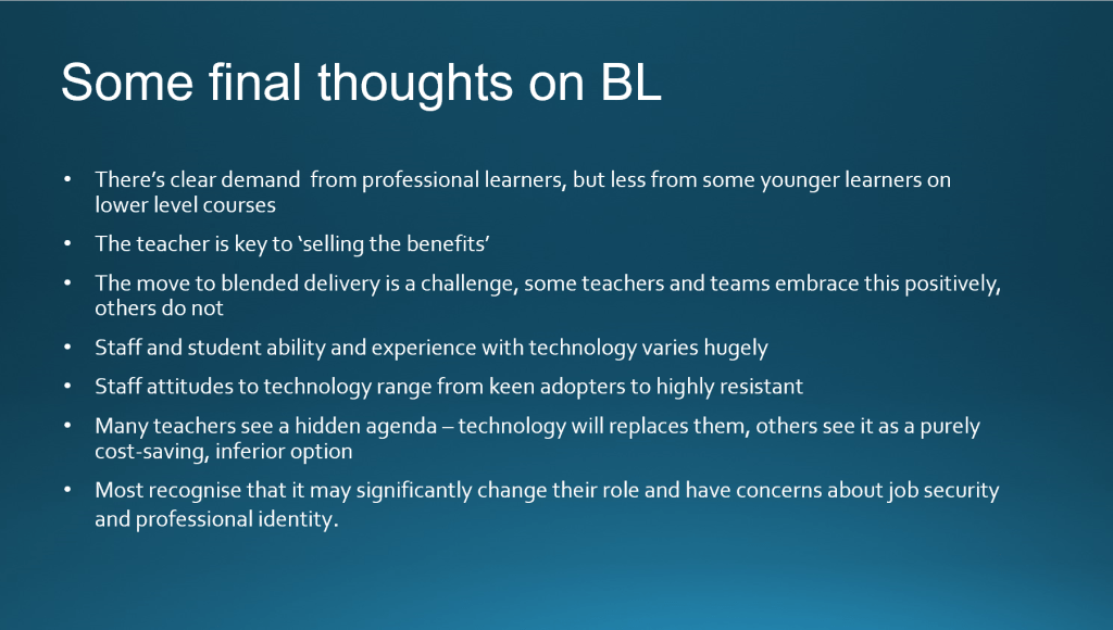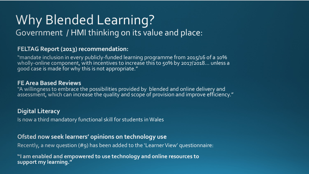 When supporting educators and FE learners in the use of learning technology, I find that the most important phase is the initial work to persuade them that use of learning technology brings positive benefits, time savings and allows them to be more creative in their practice. An important first step is to acknowledge teachers’ existing pedagogy and that they are specialists in their own learning contexts with expertise to bring to the choice and deployment of technologies. They know the learners that they are working with best in terms of needs and abilities, so I believe it is vital not to impose technologies onto teachers.