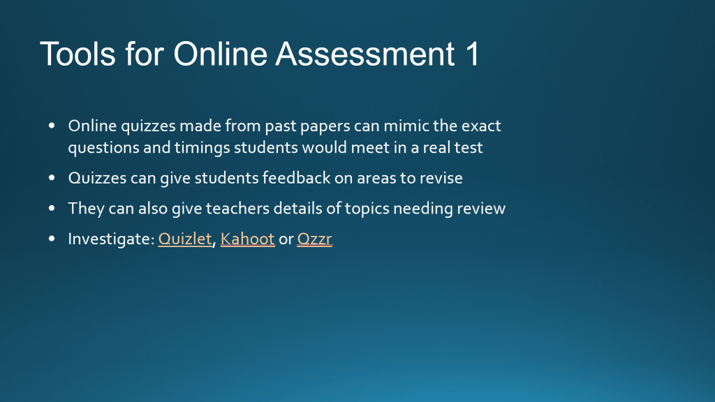 The next phase is to provide them with options of which technologies to deploy, whenever possible, and allow them time to critically appraise these and make their own choices. For example when discussing formative assessment I embed and model live examples of quizzes such as Mentimeter questions and polls, Kahoot gamification, EdPuzzle video quizzes or Quizlet flashcards naturally into sessions as learning refreshers so that teachers have the opportunity to experience these just as learners would.