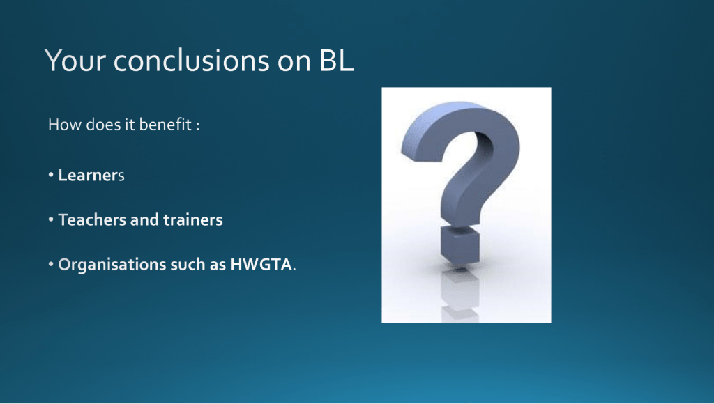 I end each course with a plenary discussion asking learners to discuss what they found most useful and most challenging and by asking them all to outline one or two actions that they will immediately put in place in their own practice. In my work for HWGTA and MET Academy this discussion is augmented with written feedback elicited via a Microsoft Office feedback form shared with learners via QR code enabling them to relate impressions and impacts of the course. The challenge here, of course, is that requesting that delegates complete a feedback form at the end of the day’s training means that busy people may forget, not always find time to complete the feedback, or might give minimal, complimentary responses.